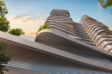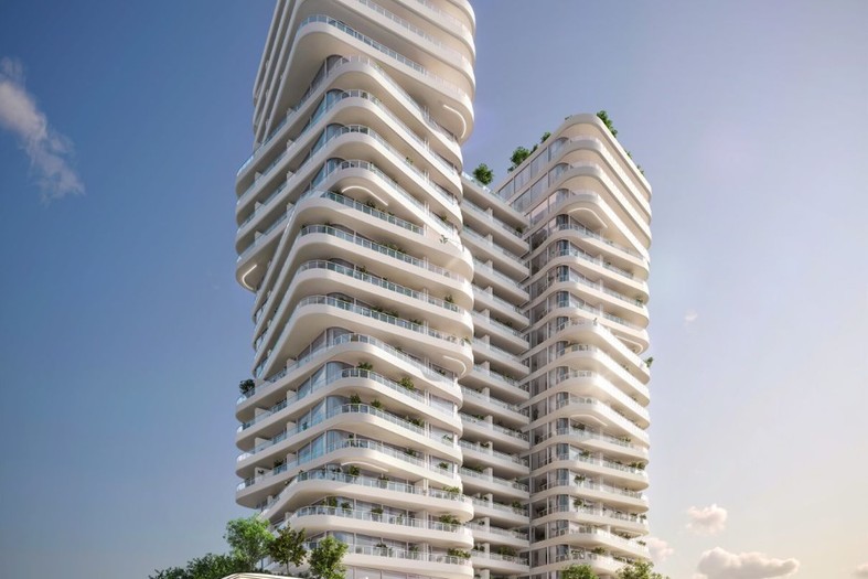 The tower comprises residential units designed with contemporary layouts. The apartments are described as featuring floor-to-ceiling windows and private balconies, supporting natural light and a modern residential configuration aligned with the overall design of the building.