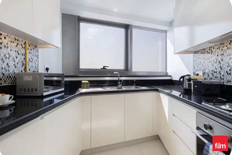 Designed with a modern touch, the apartment features a spacious layout complemented by floor-to-ceiling windows that bring in natural light and offer impressive views of the surrounding skyline. The open-plan living and dining area is tastefully furnished, while the kitchen comes fully equipped for everyday convenience.