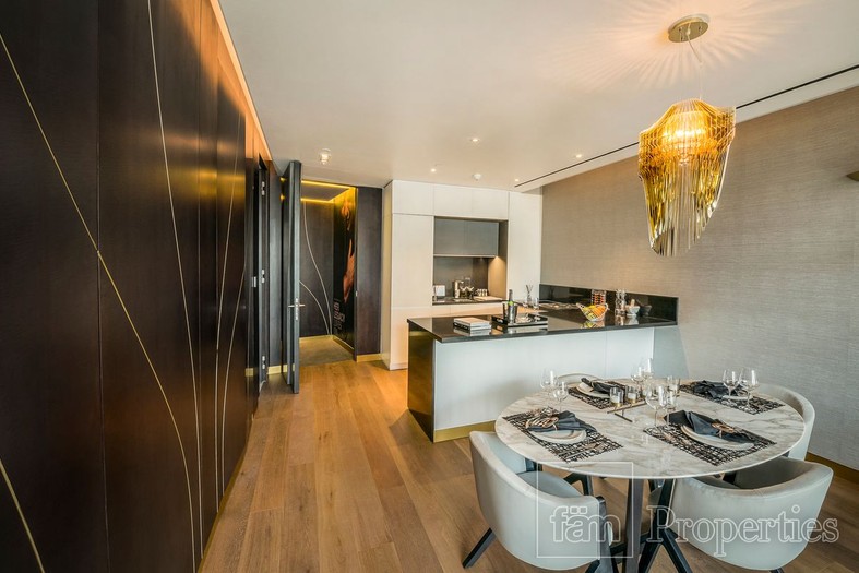 This fully furnished 1-bedroom residence offers sweeping canal views through floor-to-ceiling glass, with interiors that are unmistakably Zaha — sculptural bed frames, organic-shaped furniture, book-matched marble bathrooms, and flowing gold accents throughout. The open-plan living and dining area connects seamlessly to a fully equipped kitchen, while a striking dark lacquered partition separates the bedroom for privacy without losing the sense of space.